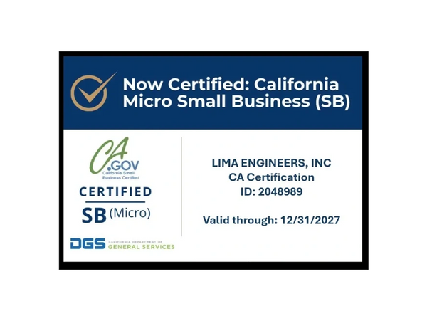 LIMA Engineers is a California-certified Micro-Small Business dedicated to delivering reliable, efficient, and innovative engineering solutions for public-sector and infrastructure projects. Our state certification not only demonstrates compliance with rigorous eligibility standards—it also reinforces our credibility, accountability, and long-term commitment to partnering with California agencies and prime contractors.